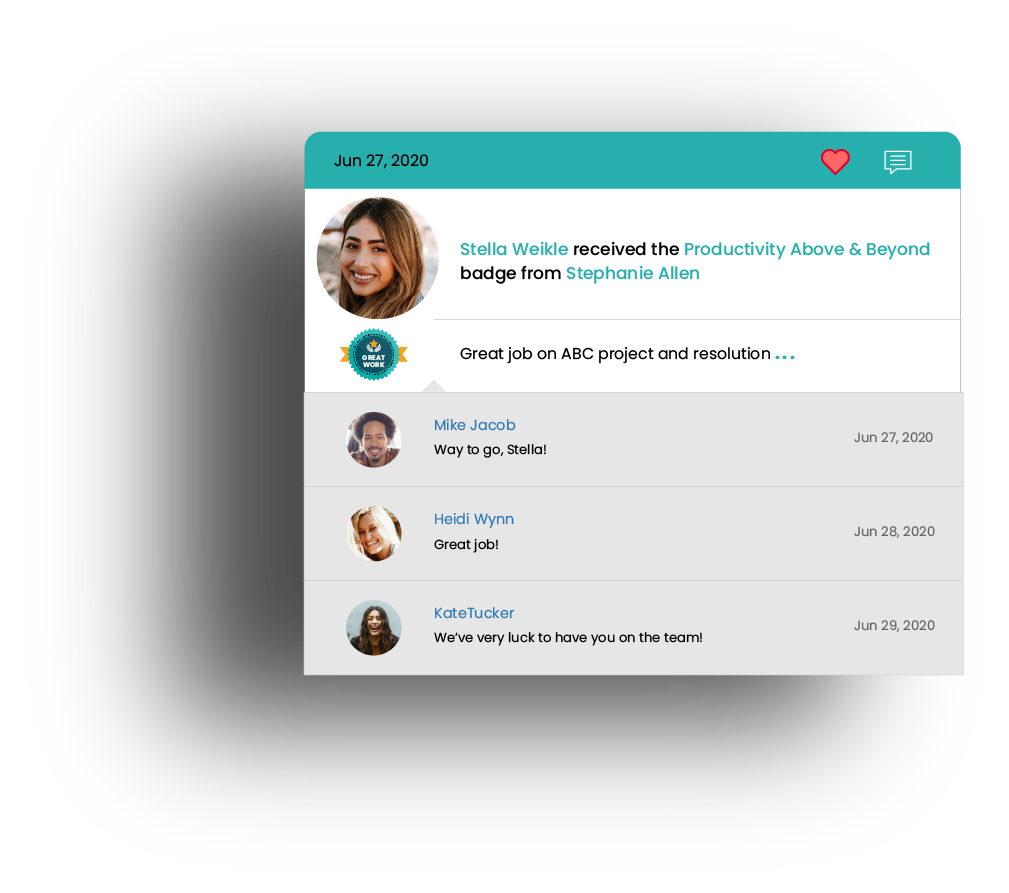 VIBE RECOGNITION Builder guides your employees through the quick steps that will transform a simple recognition message into a story that sticks, connects and inspires.