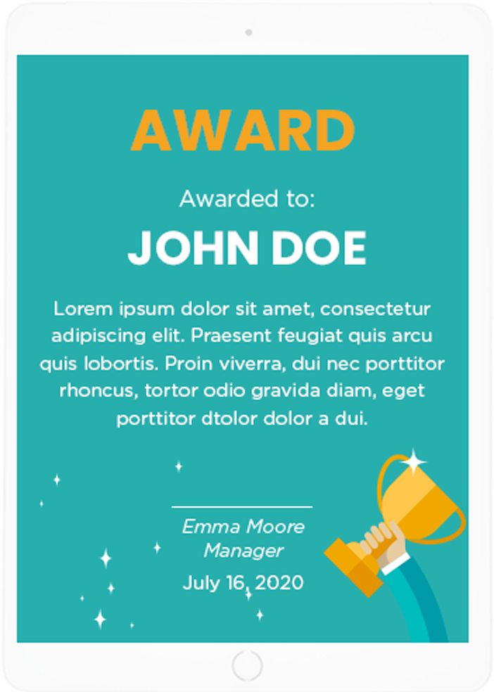 Along with a beautiful certificate printable right from the VIBE RECOGNITION platform, you may choose to award points redeemable for an impressive array of rewards, present your own commemorative plaque or trophy or gift – or all three.